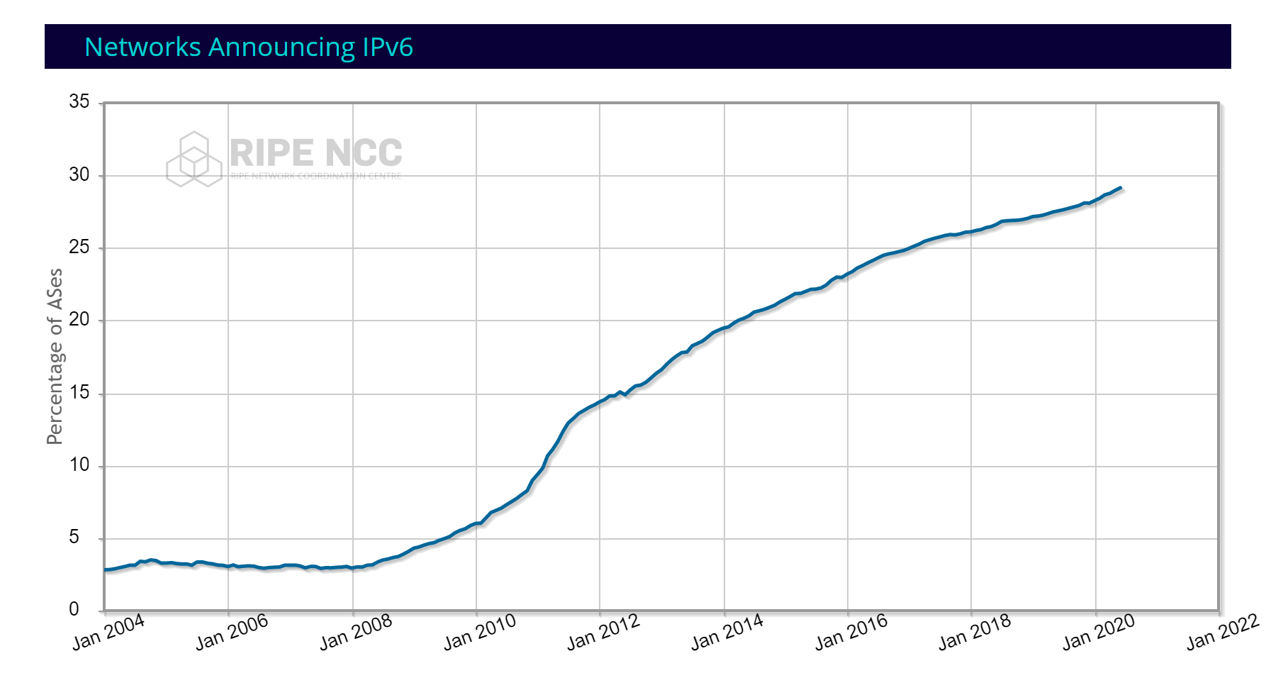 The progress of IPv6 can be showed looking at the percentage of networks (Autonomous Systems) that announce one or more IPv6 prefixes in the RIPE NCC service region: